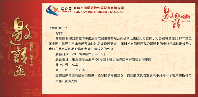 誠邀您參加2017年第二屆中國(臨沂)電線電纜及線材制品設(shè)備展覽會,本屆展會受臨沂市人民政府、電業(yè)局支持舉辦,東莞中諾質(zhì)檢儀器設(shè)備有限公司將參展本次展會,屆時將向您展示我公司新一代的電線電纜檢測設(shè)備。