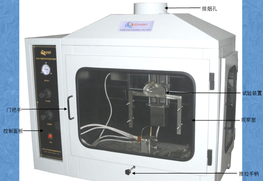 建筑材料可燃性試驗機由控制箱、燃燒箱本體、燃燒器、電磁閥、高壓點火器、信號控制線及試樣支架組成。