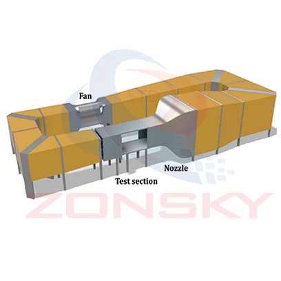 用于模擬汽車、列車、動車、高鐵、隧道風洞試驗,為吸入式直流傳熱風洞。風量由風機出口的風門調節,空氣由吸風口吸入,經入口段、整流段、收縮段、穩定段、溫度測量段,體積流量測量段、試驗段、再到穩定段、長方圓收縮段、測速段、U型差壓計、皮托管、傾斜式微壓測量、擴壓段、段尾、段尾口、風機接口、風機,電壓、電流等傳感器等組成。