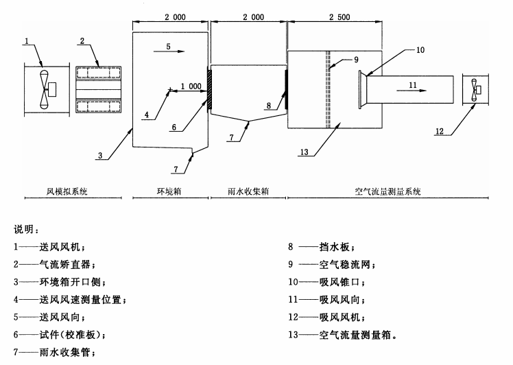 3.1設備組成:由風模擬系統、環境箱、雨水收集箱、空氣流量測量系統組成。檢測設備整體的組成