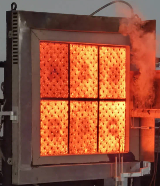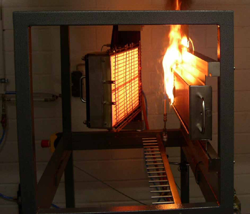 1.2 測試方法:在燃燒箱內用燃氣噴燈點燃樣品,燃氣輻射板與燃氣噴燈在同一方向施加于試樣,輻射板的輻射強度在離75mm處為32.5kw/m2(表面),噴燈的火焰高75-100mm。樣品暴露在輻射熱源板下10min。記錄1.5分鐘及10分鐘樣品的火焰傳播程度。